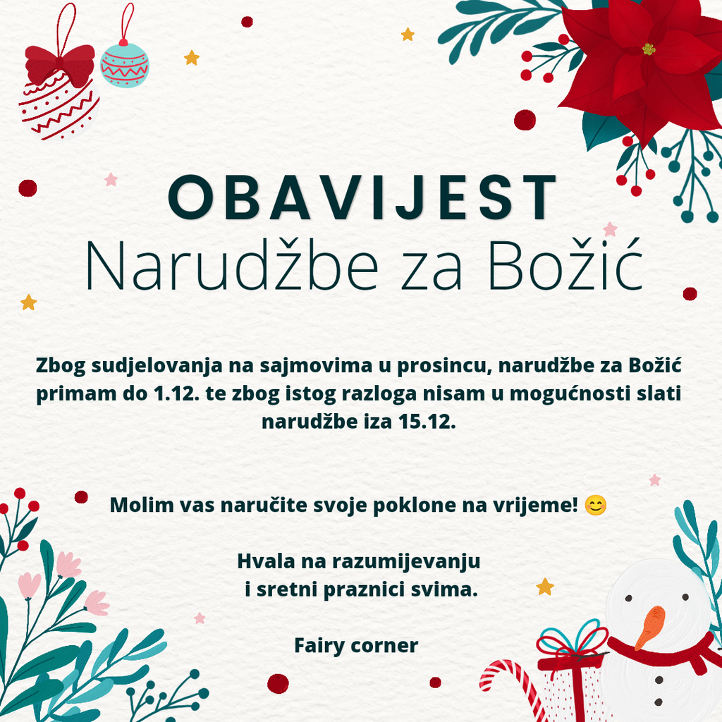 Zbog sudjelovanja na sajmovima u prosincu, narudžbe za Božić (misli se na narudžbe po želji) primam do 1.12.